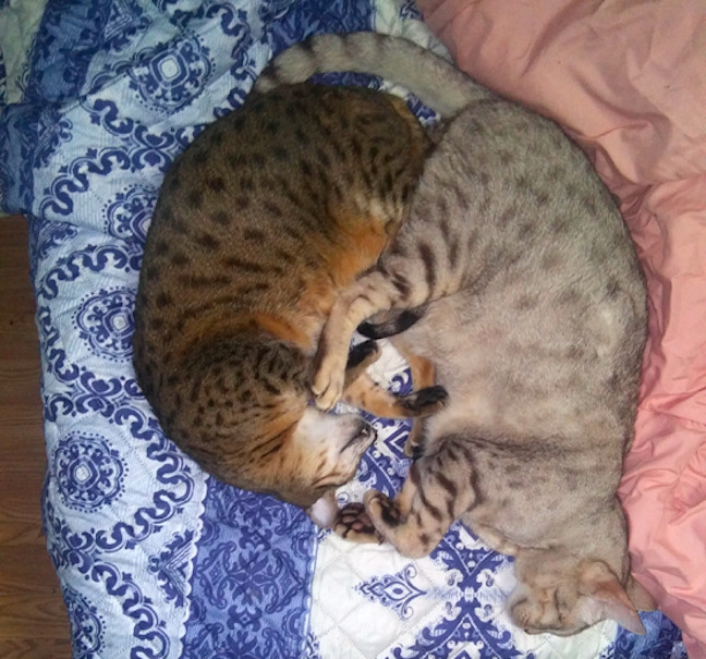 Pictures posted in this blog Ocicat male Paylor and Savannah female Pay Pay. When Pay Pay was weaned, she sought refuge of another, it was Paylor. Though they are closely bonded her relationship with him is the greatest. She gets depressed and gets sick when they apart. Paylor’s been suffering from ear problems since he was six weeks old. This caused three major surgical procedures. Every surgery required him to be separated from other animals for days, approximately one to two weeks. In the course of these detachments, I notice that Pay Pay becomes depressed. She wasn’t herself, clingy, lying down and sometimes seems to be searching. I’m sure she was looking’ for Paylor. The day Paylor returned home when it was good for him to be with the others, it was a spectacle to watch. The minute she saw Paylor, it was gold. Instantly, they were together, rubbing, snuggling and cleaning, and she didn’t want to lose sight of him for days. The images of the pair on this blog are what I see each day.